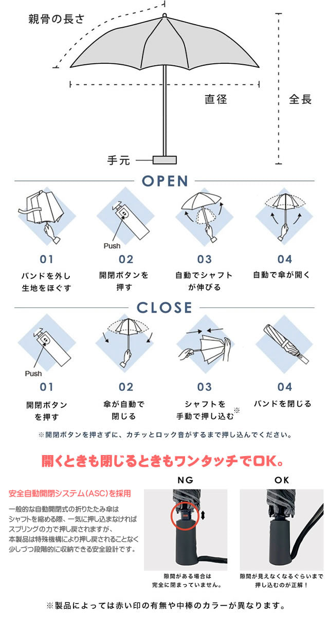 * Improper button operation may cause malfunction. Please be sure to read the accompanying instructions before use. How to use the automatic opening and closing umbrella